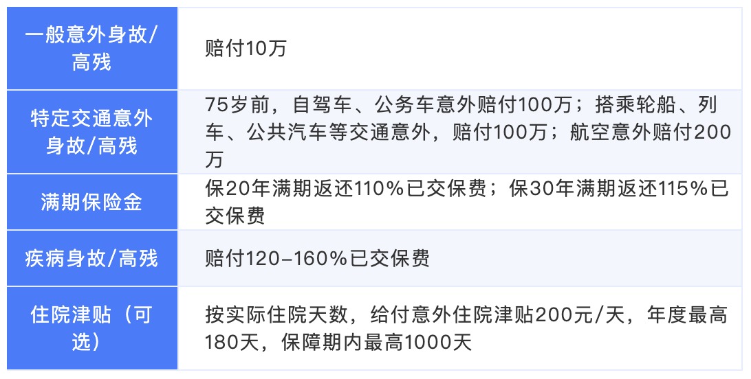 例如,中國x壽的百萬如意行長期意外險,產(chǎn)品名稱說的百萬只是針對交通意外身故和高殘才有,而對應其它更多意外情況的一般意外和高殘,保額只有10萬。