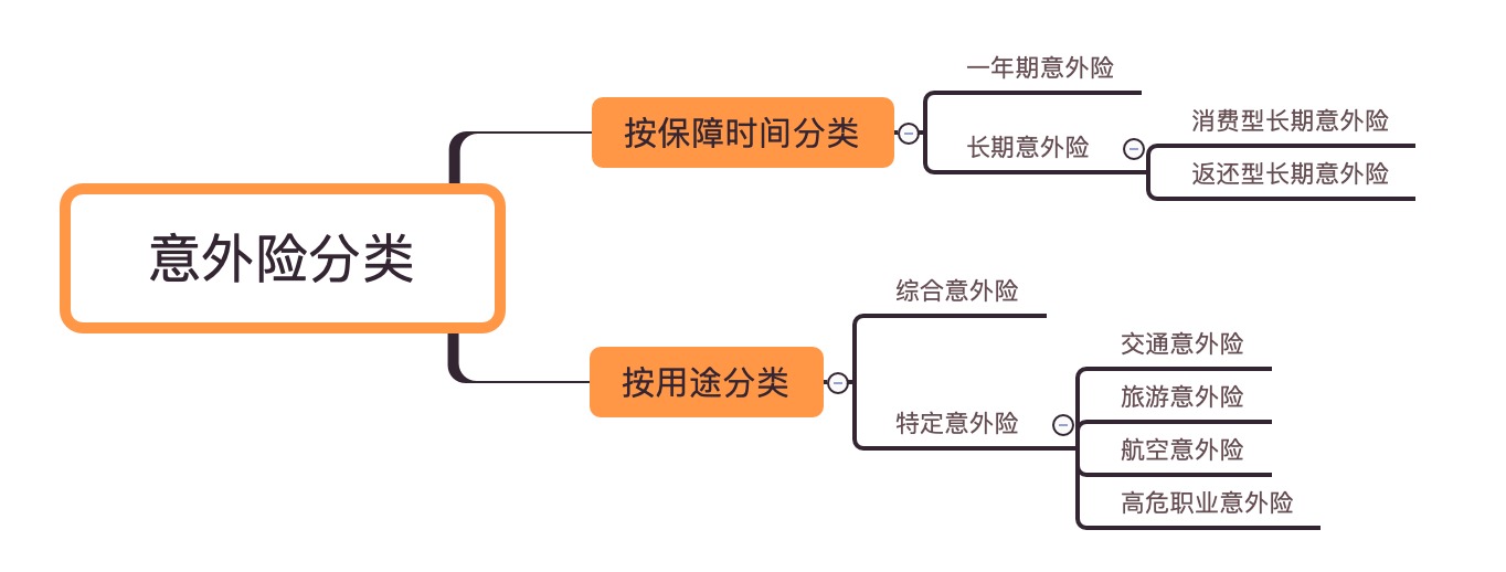 雖然意外險相比健康險不算復雜,但是意外險種類繁多,下圖從保障期限和用途對意外險做了簡單分類: