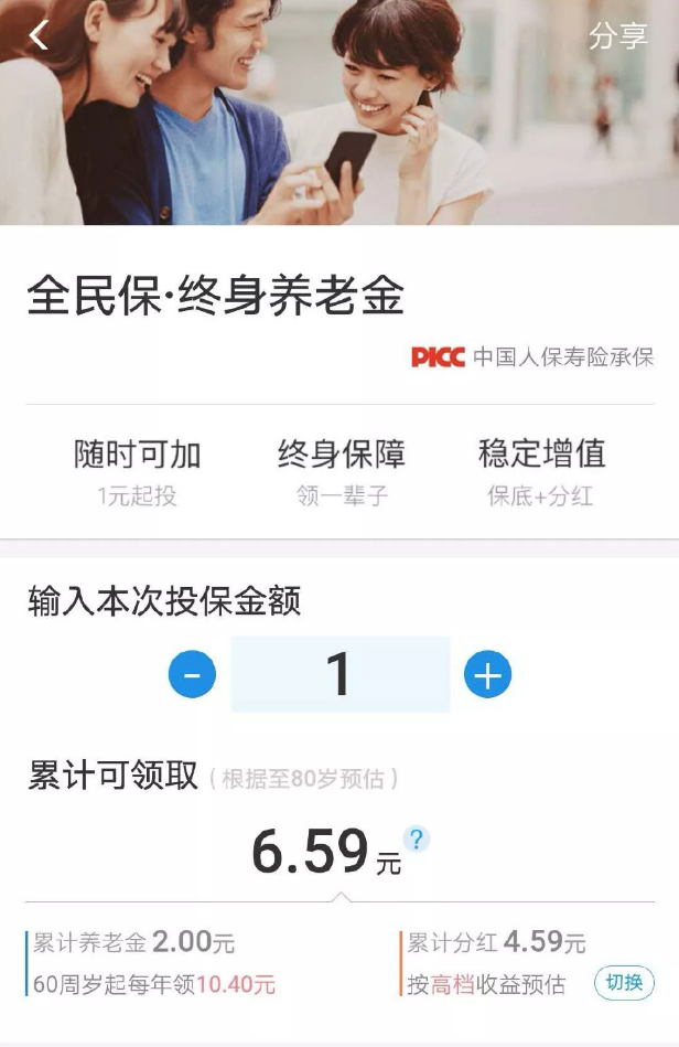 支付寶全民保·終身養(yǎng)老金,條款名叫:人保壽險聚財保養(yǎng)老年金險(分紅型)。背后的承保公司是中國人保集團的“人民人壽保險公司”,支付寶和他結(jié)合,可以被視為一個強大的聯(lián)盟。